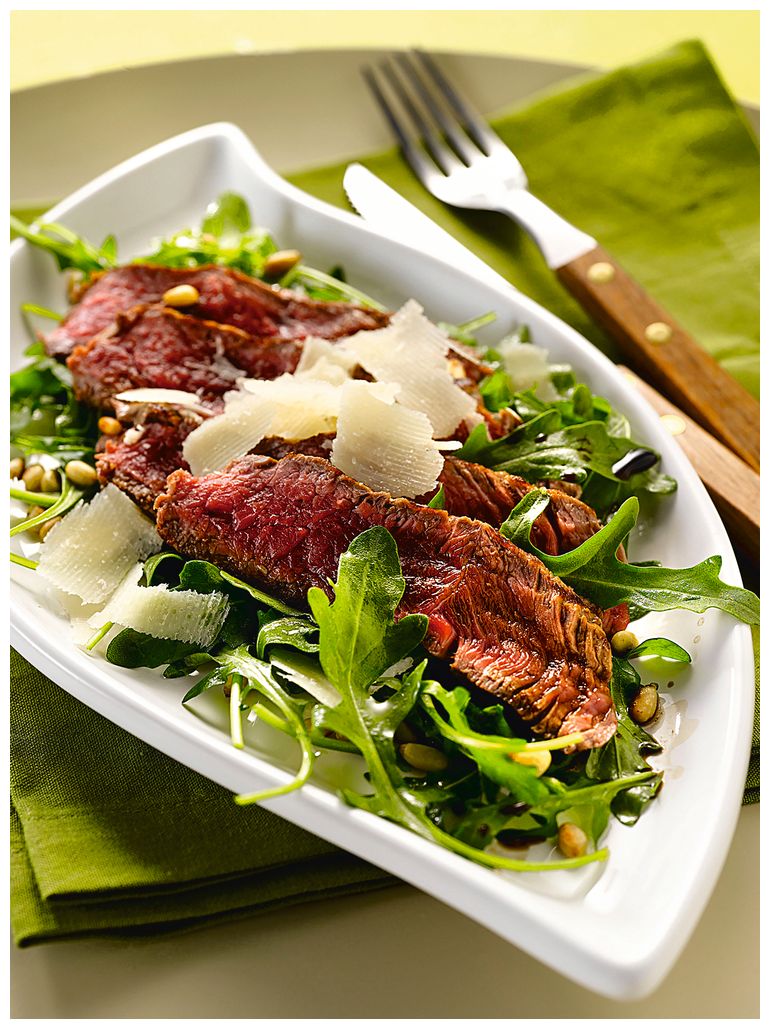 6. Нарежьте мясо на кусочки шириной 0,5 см и выложите их на руколу. Сверху посыпьте кедровыми орехами и стружкой пармезана, сбрызните небольшим количеством оливкового масла и уксуса. Подавайте на стол с хрустящим хлебом.