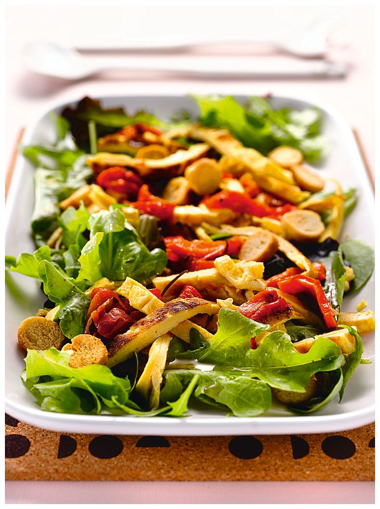 4. Переложите омлет на разделочную доску, нарежьте его полосками и добавьте их к салату.
