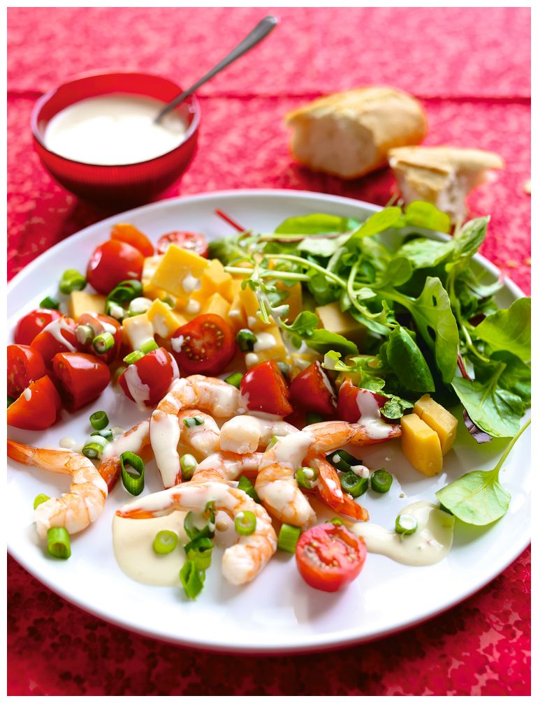 Салат с креветками, сыром чеддер и сладким соусом чили