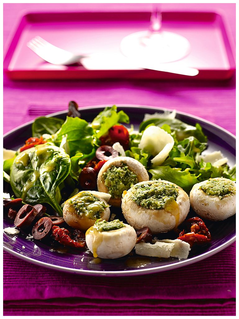 Салат с шампиньонами, фаршированными соусом песто из руколы