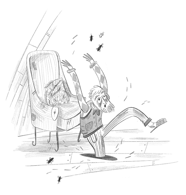 В этот самый миг сквозь доски пола просунулись две руки, ухватили Дедулю за лодыжки, сдёрнули его с кресла и утащили сквозь пол.