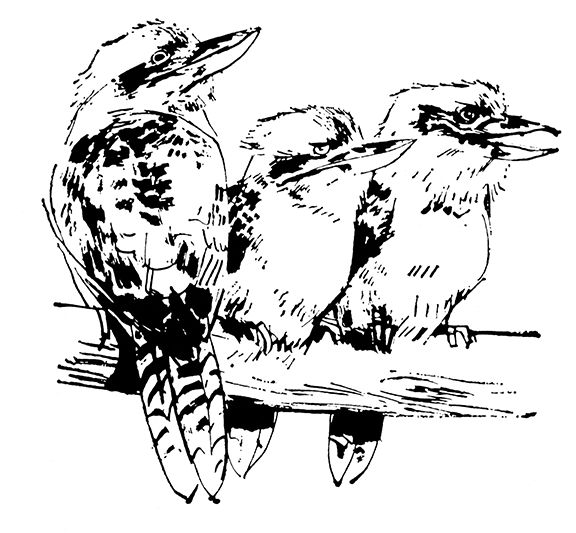 Мы так настроились на поиски лирохвостов, что встречи с другими лесными жителями явились для нас полным сюрпризом. Первыми нам попались три дородных птенца кукабары – три «смешливых дурака», как называют в Австралии этих гигантских зимородков. Тройка сидела в ряд на ветке, красуясь шоколадно-серым оперением с нарядными синими заплатами крыльев. Полоска черных перьев на голове образовала как бы полумаску, придавая птенцам неожиданное сходство с тройкой толстых мальчишек, играющих в бандитов. К нашему удивлению, зимородки, завидев нас, издали резкий стрекочущий клич, слетели вниз и сели прямо перед нами, после чего запрыгали взад-вперед и принялись сипло кричать, взмахивая крыльями и просительно разевая свои широкие клювы. Айра, лучше нас знавшая обычаи Шербрукского леса, преспокойно извлекла из кармана большой кусок сыра, и мы стали потчевать крикунов этим несколько неожиданным лакомством. Наконец, набив себе живот сыром, зимородки тяжело взлетели на сук и опять устроили засаду, подстерегая новых жертв.