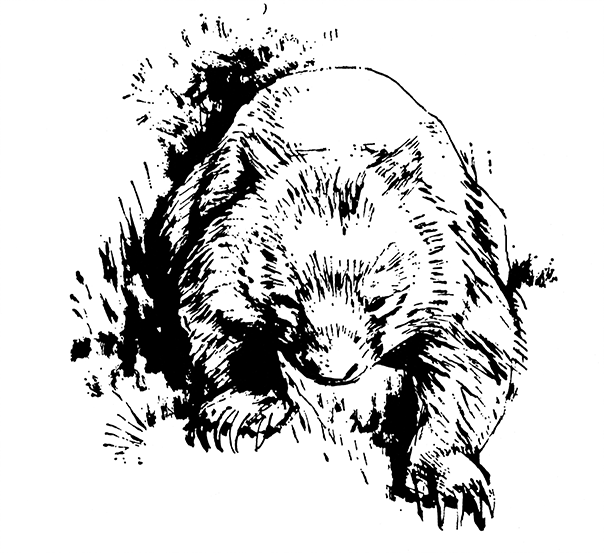 Выйдя из кустов, вомбат на секунду остановился и с каким-то грустным видом громко чихнул. Потом встряхнулся и, уныло волоча ноги, зашагал прямо на меня – этакий игрушечный мишка, который знает, что дети его разлюбили. Совершенно убитый, ничего не видя перед собой, он продолжал приближаться ко мне, явно поглощенный какими-то очень мрачными мыслями. Я стоял абсолютно тихо, и вомбат только тогда заметил меня, когда его отделяли от моих ног каких-нибудь два-три метра. К моему удивлению, он не бросился наутек, даже не убавил шаг, а подошел ко мне и с легким интересом во взоре принялся осматривать мои брюки и ботинки. Еще раз чихнул, потом горько вздохнул и, бесцеремонно оттолкнув меня, побрел дальше по тропе. Я пошел за ним, но вомбат вскоре свернул в лес, и я его потерял.