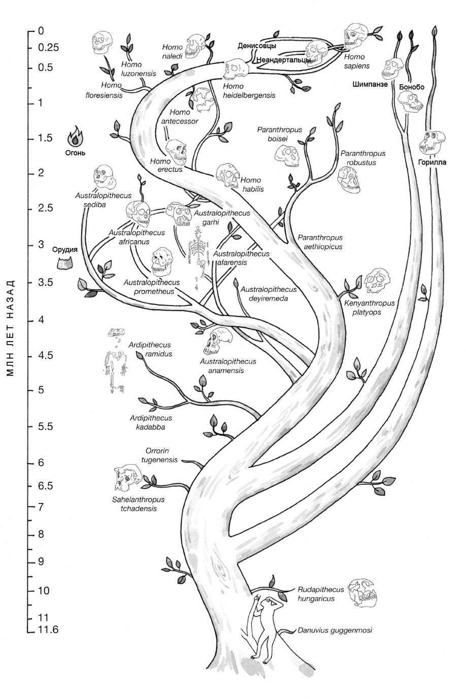 Палеонтологи обнаружили более 25 видов ископаемых предков человека и их вымерших родственников (гоминин) и присвоили им научные названия. На страницах этой книги вы встретитесь со многими из них – здесь они представлены по их названиям и характерным окаменелым остаткам. Хотя мы знаем, когда жили эти гоминины (см. рисунок ниже: по вертикальной оси – время в млн лет назад), остается неясным, насколько родственными друг другу были их виды. На этом древе изображены возможные связи, однако, судя по генетическим данным и недавно найденным окаменелостям, некоторые части генеалогического древа человека представляют собой сложное хитросплетение взаимосвязанных ветвей. Безусловно, дальнейшие открытия в чем-то еще больше усложнят эту картину, а в чем-то упростят.