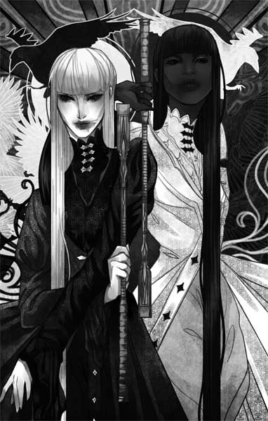 Они подняли руки в нашу сторону, хотя одна указывала правой, а другая – левой. Они казались отражением друг друга, не только в движении, но и внешне. Первая была черноволосой, с кожей цвета эбенового дерева – дочь равнин Зюдхейма. Вторая же – пепельноволосая, с кожей цвета светлого мрамора – дитя гор Элидэна. Их одежда тоже контрастировала: светлая на темной, темная на светлой. Но глаза у обеих выглядели бездонными озерами, совершенно черными от бессчетных столетий, что они ходили по этой земле бессмертными стопами.