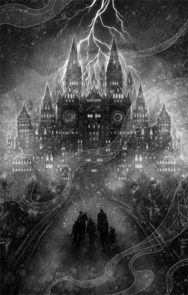 Задыхаясь, мы остановили измученных лошадей. Впереди нас ждал край утеса, словно умоляя нас спуститься в воющую тьму. И из этой пропасти поднималась башня – отвесный гранитный шпиль, соединенный с краем утеса узким каменным мостом. Под аркой пролета, над ревущей внизу пропастью, на длинных цепях болтались железные виселицы. Вдоль перил стояли статуи: святые и ангелы выглядели такими живыми, что мне показалось, будто они не вырезаны, но прокляты – заколдованы какой-то магией, превратившей их теплую плоть в холодный камень. А по ту сторону моста…