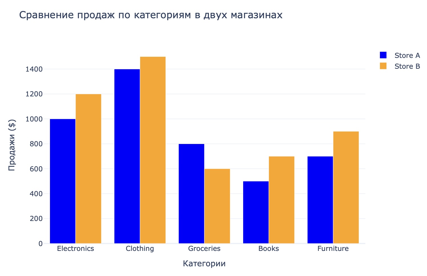 Постройте группированный столбчатый график для сравнения продаж в двух магазинах.