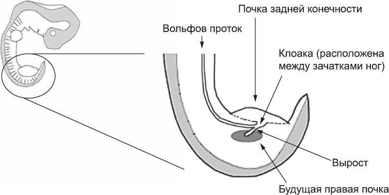 [Закрыть] Для контроля над процессами развития разные органы часто используют одни и те же молекулы. Поэтому я не буду описывать развитие всех органов по отдельности, а расскажу только о постоянной почке, постаравшись проиллюстрировать на этом примере принципы, общие для всех органогенезов.