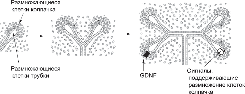 Рис. 49. Взаимозависимость клеток колпачка и клеток ветвящейся трубки. Клетки колпачка синтезируют GDNF, под действием которого клетки трубки размножаются, а трубка ветвится. Клетки трубки в свою очередь синтезируют факторы, которые поддерживают пролиферацию клеток колпачка. Совместное действие этих сигналов приводит к тому, что в процессе роста эти две популяции клеток находятся в равновесии