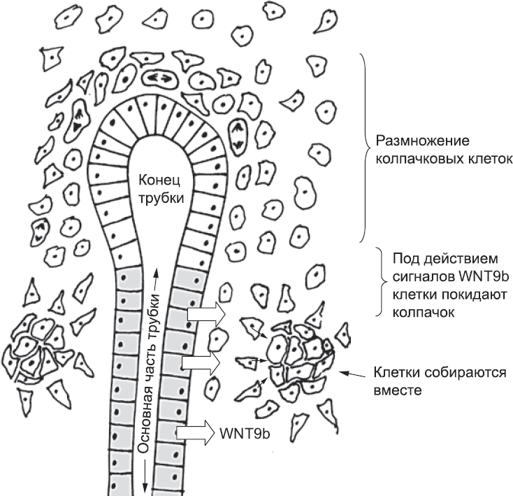 Рис. 50. Колпачковые клетки, отставшие от кончика трубки в результате ее роста, оказываются рядом с той частью трубки, где клетки секретируют белок WNT9b. Под действием этой и, возможно, некоторых других молекул мезенхимальные клетки группируются и готовятся сформировать нефрон