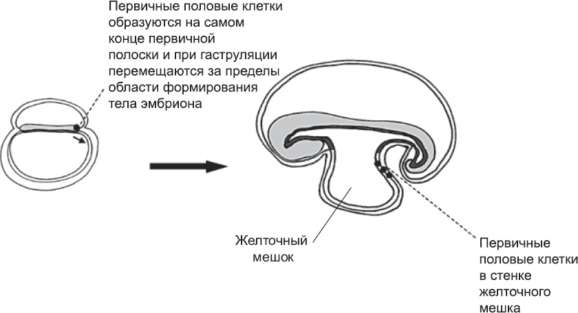 Клетки зародышевой линии (первичные половые клетки) впервые выявляются перед самым началом гаструляции, когда в эпибласте на заднем конце первичной полоски обосабливается группа из примерно пятидесяти клеток (глава 4). Вероятно, эти клетки вовлекаются в гаструляцию на очень ранних этапах, а затем они движутся вместе с мезодермой, которая выходит за пределы тела эмбриона.[203]203