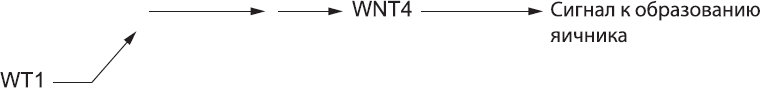 Рис. 58. Женский путь развития: экспрессия WT1 в конечном итоге приводит к экспрессии WNT4, а он подает клеткам гонады сигналы к образованию яичника