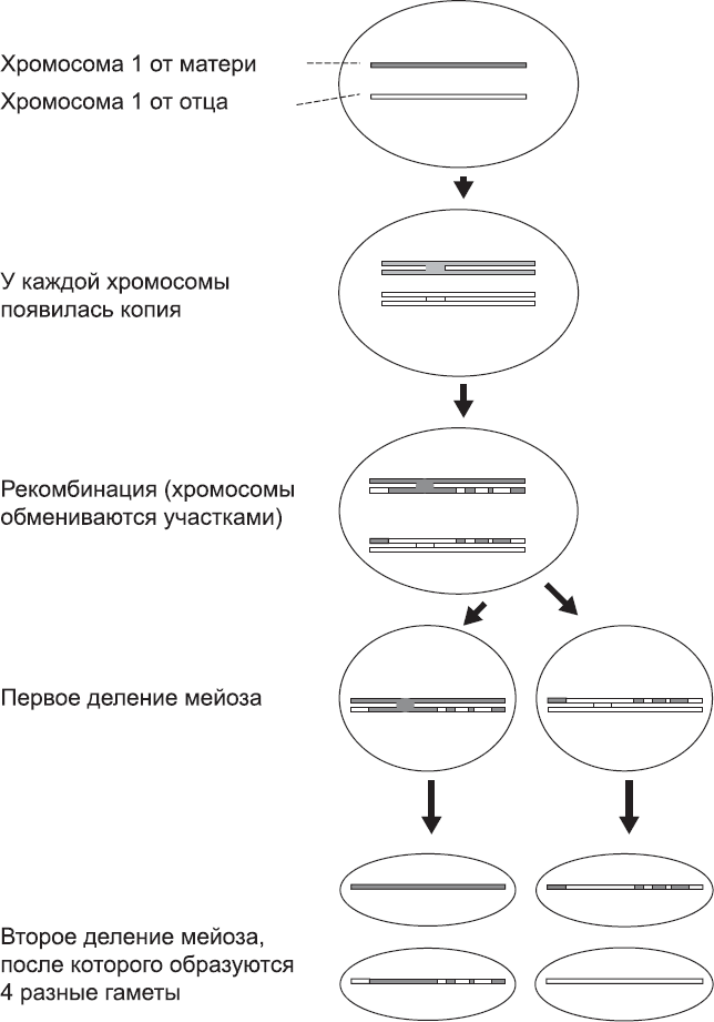 Рис. 60. Рекомбинация между хромосомами при мейозе (в данном случае в семеннике). Для лучшего восприятия на схеме изображена только одна пара из двадцати трех пар хромосом человека. Как и в случае любого деления, сначала все хромосомы копируются. Затем происходит событие, характерное только для мейоза, – унаследованная от матери копия хромосомы обменивается участками с копией, унаследованной от отца (происходит рекомбинация). После окончания этого этапа происходят два клеточных деления и образуются четыре гаметы, каждая из которых несет свою собственную (и отличающуюся от исходной) версию хромосомы 1. То же самое произойдет и с хромосомами 2–21, а вот хромосомы последней пары (X и Y) не рекомбинируют. Похожий процесс происходит и в яичниках женщины, но после каждого этапа деления одна дочерняя клетка погибает, и в результате образуется не четыре гаметы, а одна