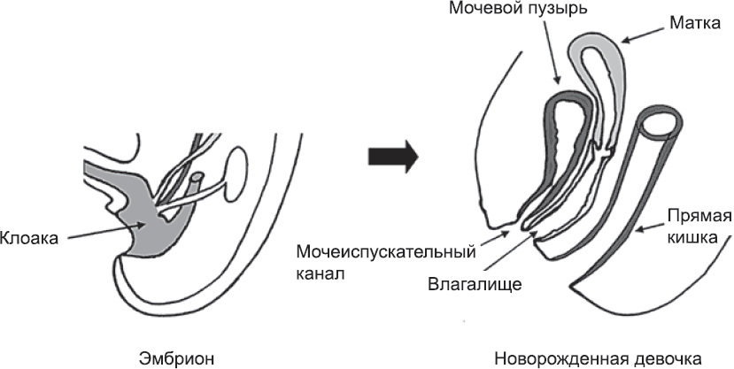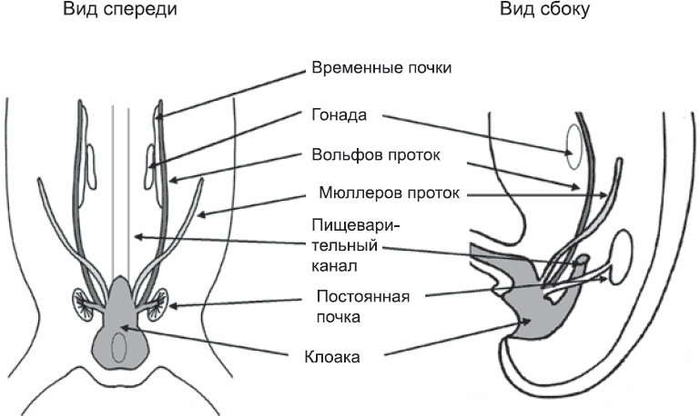 Рис. 62. В ходе разделения клоаки эмбриона образуются отдельные отверстия мочевыделительной, женской репродуктивной и пищеварительной систем