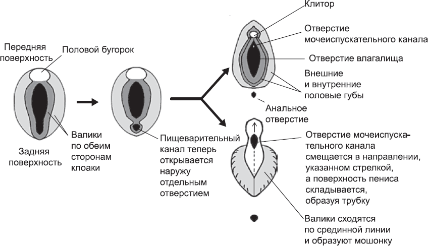 Рис. 63. Формирование мужских и женских наружных половых органов из одной и той же исходной ткани. На схеме показан участок между ногами развивающегося эмбриона (вид снизу). Сначала имеется отверстие клоаки, окруженное тремя утолщениями (педантичные анатомы делят их на подтипы, но, чтобы понять общую схему процесса, вполне достаточно знать, что утолщений три). После обособления анального отверстия и отверстия мочеполовой системы утолщения развиваются: половой бугорок увеличивается, превращаясь в клитор или пенис, а половые валики образуют половые губы или, смыкаясь по срединной линии, формируют мошонку