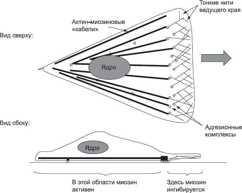 Рис. 35. Схема расположения тонких микрофиламентов у переднего края клетки, адгезионных комплексов в задней его части и актин-миозиновых «кабелей», идущих в заднем направлении