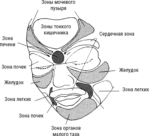 Вслед за восточными врачами и выдающимися русскими клиницистами пристально всмотримся в свое лицо. Подобно ладони и стопе, лицо зонируется на проекции внутренних органов и систем (рис. 5).