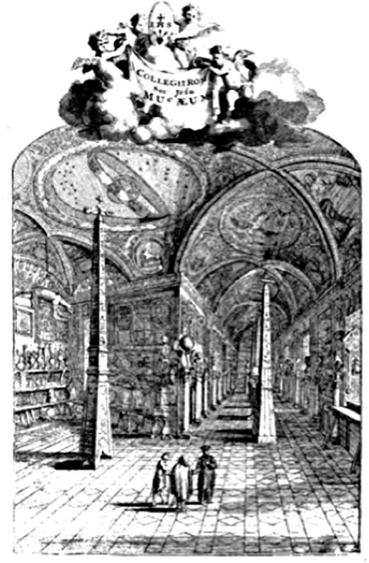 – Затем отец Кирхер основал музей в Ватиканском университете, где он преподавал и занимался научными исследованиями, – продолжал тем временем Новак. – В Кирхеровском музее хранилось огромное собрание древностей, а также обширная библиотека и некоторые изобретения самого преподобного отца. Чтобы вы лучше представили себе масштабы этого музея, а также то, с каким уважением относились к самому Кирхеру современники, взгляните на вот эту гравюру.