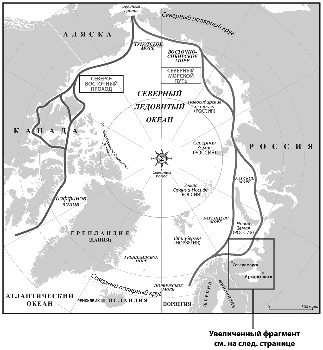 На протяжении многих веков практически все земли, находящиеся севернее Северного полярного круга, оставались ничейными. Восемь стран граничат с Арктическим регионом – Россия, Канада, Финляндия, Норвегия, Исландия, Дания (Гренландия) и Соединенные Штаты, – однако ни одна из них не имеет территориальных притязаний на значительную часть Арктики. Конвенция ООН по морскому праву определяет исключительную экономическую зону государства как часть моря шириной в двести морских миль от береговой линии – если только континентальный шельф не простирается дальше; в этом случае ширина исключительной экономической зоны увеличивается до трехсот пятидесяти морских миль. Все, что находится за этими пределами, считается открытым морем. Этот международный закон на протяжении десятилетий оберегал бо́льшую часть Арктики от полномасштабного освоения.