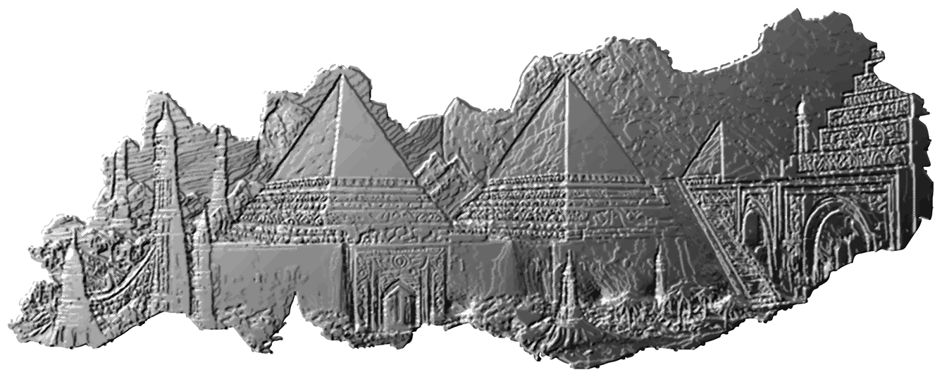 Почти вся изогнутая поверхность, очищенная до кости, превратилась в холст для древнего художника, вырезавшего на нем замечательный рисунок, проработанный в мельчайших деталях. К сожалению, время и непогода не пощадили работу, оставив от нее только несколько отдельных кусков. Тем не менее сохранившихся фрагментов хватило, чтобы увидеть какой-то город с характерными пирамидальными сооружениями.
