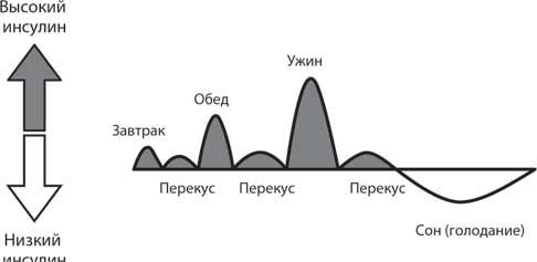 Всплески инсулина (приемы пищи) сменялись длительным периодом воздержания от пищи (сном), как показано на рис. 10.1. Но картина полностью меняется, если организм постоянно подвержен действию инсулина. Что произойдет, если вместо трех раз в день мы начнем есть шесть раз? Эта практика вошла в обиход с 1970-х годов. Каждая мама знала, что постоянные перекусы к добру не приведут: «Ты потолстеешь», «Ты перебьешь аппетит». Но в отличие от мам ведущие специалисты по питанию считают, что перекусы очень полезны для здоровья. Есть чаще, чтобы похудеть, разве эта концепция не смехотворна? Некоторые специалисты по лечению ожирения предлагают есть еще чаще, через каждые два с половиной часа.
