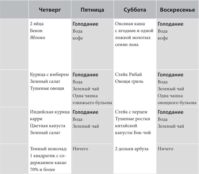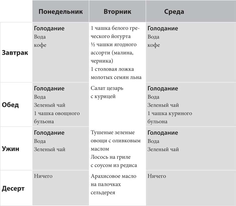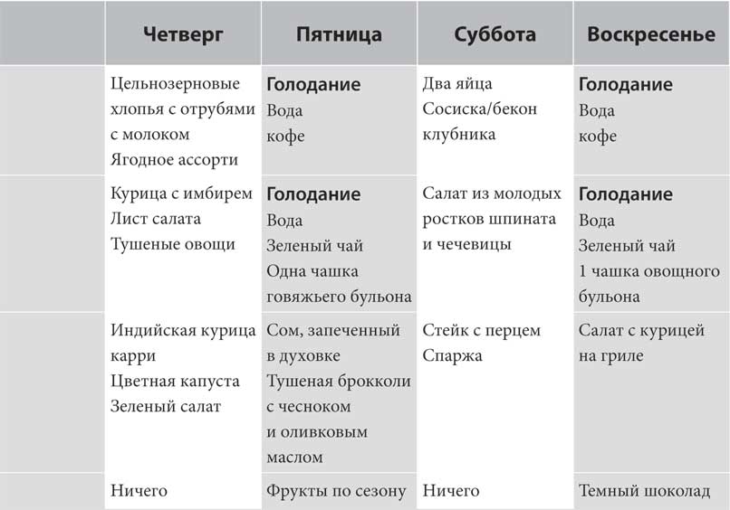 Во время 36-часового поста вы воздерживаетесь от пищи с ужина первого дня до завтрака двумя днями позднее. То есть вы пропускаете завтрак, обед, ужин и перекусы в течение одного полного дня. Вы начнете голодание в 19:00 первого дня и закончите в 7:00 утром на третий день. (В приложении А читайте примерное меню и инструкцию к правильному голоданию).