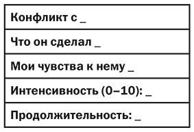 В четвертой строке оцените интенсивность чувств по шкале от 0 (хорошо) до 10 (плохо). Вам помогут определиться ответы на следующие вопросы. Насколько сложна ситуация? Насколько я зол или обижен? Как сильно неразрешенный конфликт влияет на мою жизнь?