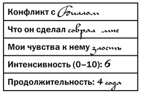 Помните, что мы стремимся к нулевому уровню, – эту фразу вы прочитаете еще не раз. Ноль – наша цель, он означает, что противоречия разрешены. На нулевом уровне вы ощущаете эмоциональную безопасность, надежность и связь. В нижней строке, под числом, напишите, сколько длится конфликт. Один день? Два месяца? Десять лет? Если он периодически возобновляется, подсчитайте среднее значение. Как заполнять таблицу конфликтов, показано на рис. 2.3.
