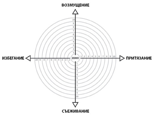 На диаграмме в центре круга находится ноль, где вы максимально связаны с собой и близкими людьми. На этом значении нам хорошо и спокойно (мы стремимся к этому состоянию). Внешний круг диаграммы пересекает отметку 10 – максимальное разобщение. Лучшие моменты в отношениях происходят на нуле, в центре круга, когда вы любите себя, окружающих и заботитесь о себе.