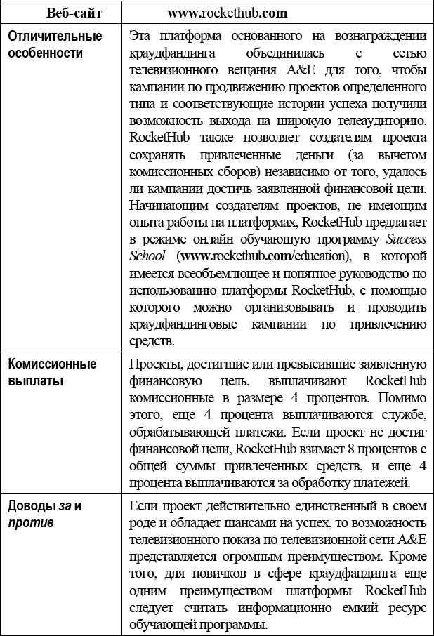 Подробнее о RocketHub можно узнать напрямую от Брайана Мииса (Brian Meece), директора-распорядителя платформы; емкое интервью с ним приводится в Главе 13.