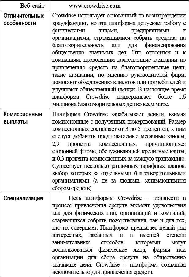 В главе 13 есть интервью с основателем Crowdrise Робертом Волфи (Robert Wolfe). В нем он рассказывает о том, что побудило его задумать и создать платформу Crowdrise. Этот человек приложил большие усилия для превращения сбора денег в основанное на взаимодействии, приятное и успешное занятие.
