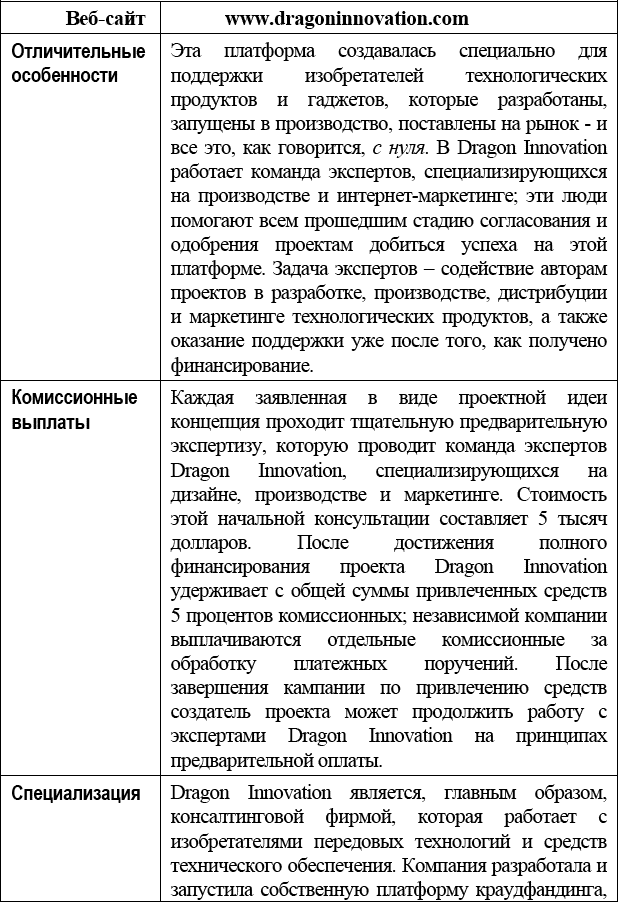 Платформа Dragon Innovation предлагает идеальное решение людям, у которых имеются идеи касательно разработки, производства, маркетинга, дистрибуции и продажи технологичной продукции. Как вам станет известно из интервью со Скоттом Миллером (Scott Miller), директором-распорядителем Dragon Innovation, которое приводится в тринадцатой главе, помимо конкурентоспособности, есть несколько других аспектов, определяющих отличие платформы Dragon Innovation от других краудфандинговых платформ.