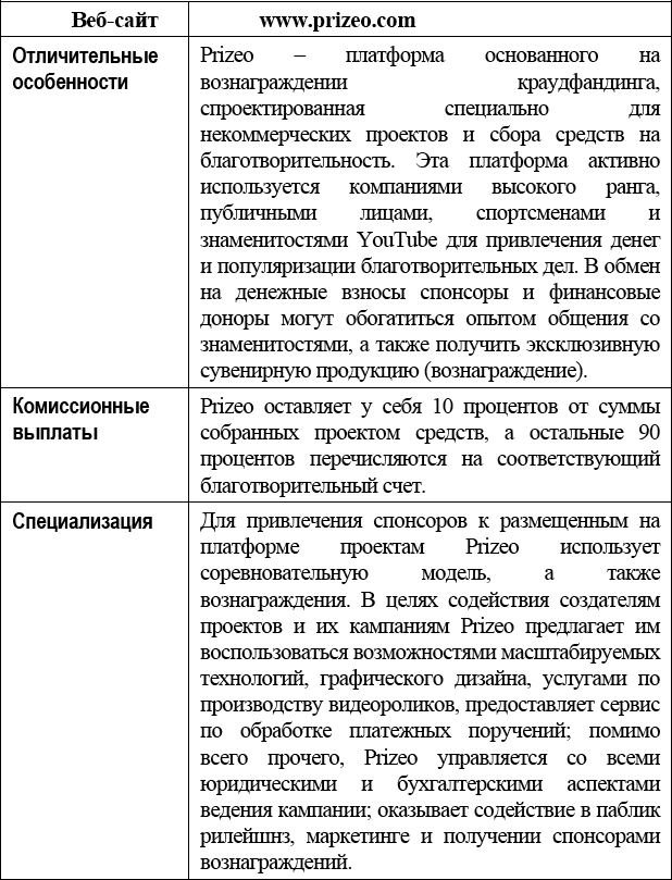 Для полного понимания принципов работы Prizeo и того, насколько сильно эта платформа отличается от других платформ для основанного на вознаграждении краудфандинга, было бы полезно сходить на сайт www.prizeo.com/prizes для ознакомления с архивом успешных кампаний и тех, которые проводятся в настоящее время.