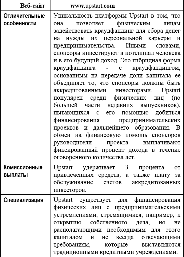 Upstart не до конца соответствует рамкам основанного на вознаграждении или передаче доли капитала краудфандинге, в которых действуют остальные платформы. Он положил начало новому и инновационному методу, который позволяет недавним выпускникам – и не только им – добиться финансирования своих бизнес-проектов или получить возможность продолжить образование, не залезая при этом в долги и не подвергая себя высокому финансовому риску. Вы узнаете больше об этой уникальной платформе краудфандинга из интервью с основателем Upstart Дейвом Жируаром (Dave Girouard) в Главе 13.