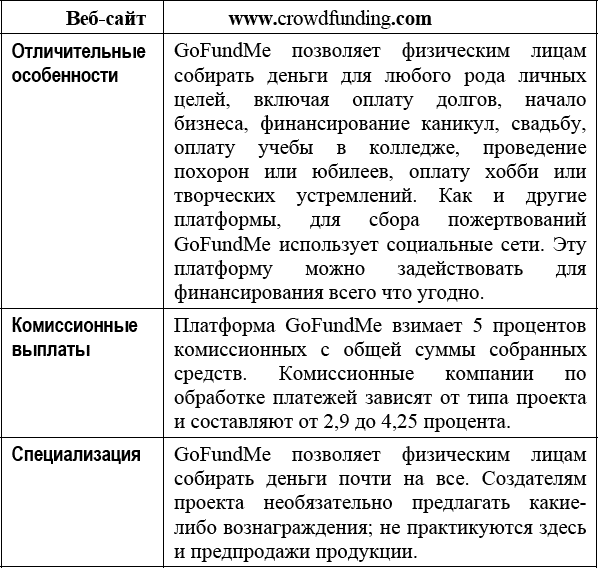 GoFundMe работает несколько иначе, нежели остальные краудфандинговые платформы, описанные в нашей книге. Хотя создатели проектов должны определить финансовую цель, отсутствуют временные ограничения на ее достижение. Кампания может пребывать в режиме онлайн любой период времени. К тому же люди, использующие GoFundMe для сбора денег, просто добиваются прямых пожертвований, не предлагая взамен ни предпродаж продуктов, ни каких-либо вознаграждений за тот или иной размер пожертвования. Создатели проекта получают все полученные от финансовых доноров деньги (за вычетом комиссионных) независимо от того, достигнута финансовая цель или нет.