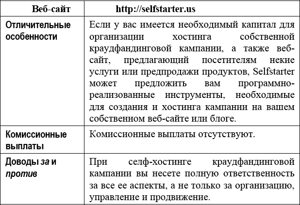 Для краудфандинговых кампаний, в основу которых положен тот или иной продукт, Selfstarter может быть хорошим решением уже в силу отсутствия каких-либо внешних правил обращения с платформой и требований соответствия содержания кампании определенным маскам-шаблонам веб-сайта. Программу Selfstarter можно скачать с https://github.com/lockitron/selfstarter.