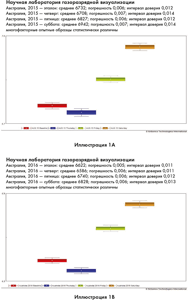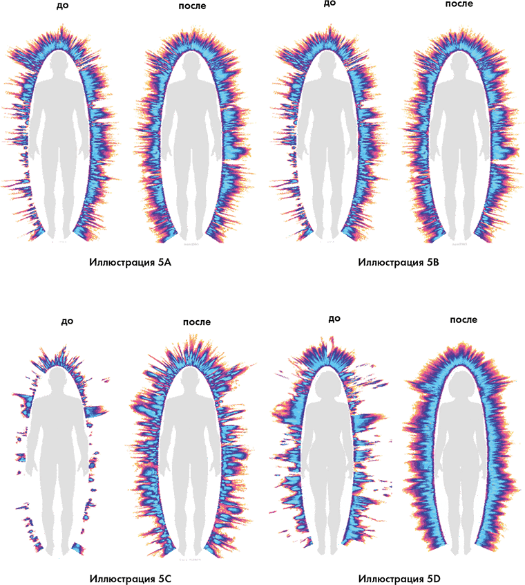Рисунки слева демонстрируют некоторые измерения газоразрядной визуализации энергии людей до начала участия в продвинутом семинаре. Рисунки справа показывают изменения в их жизненной энергии через несколько дней после семинара.