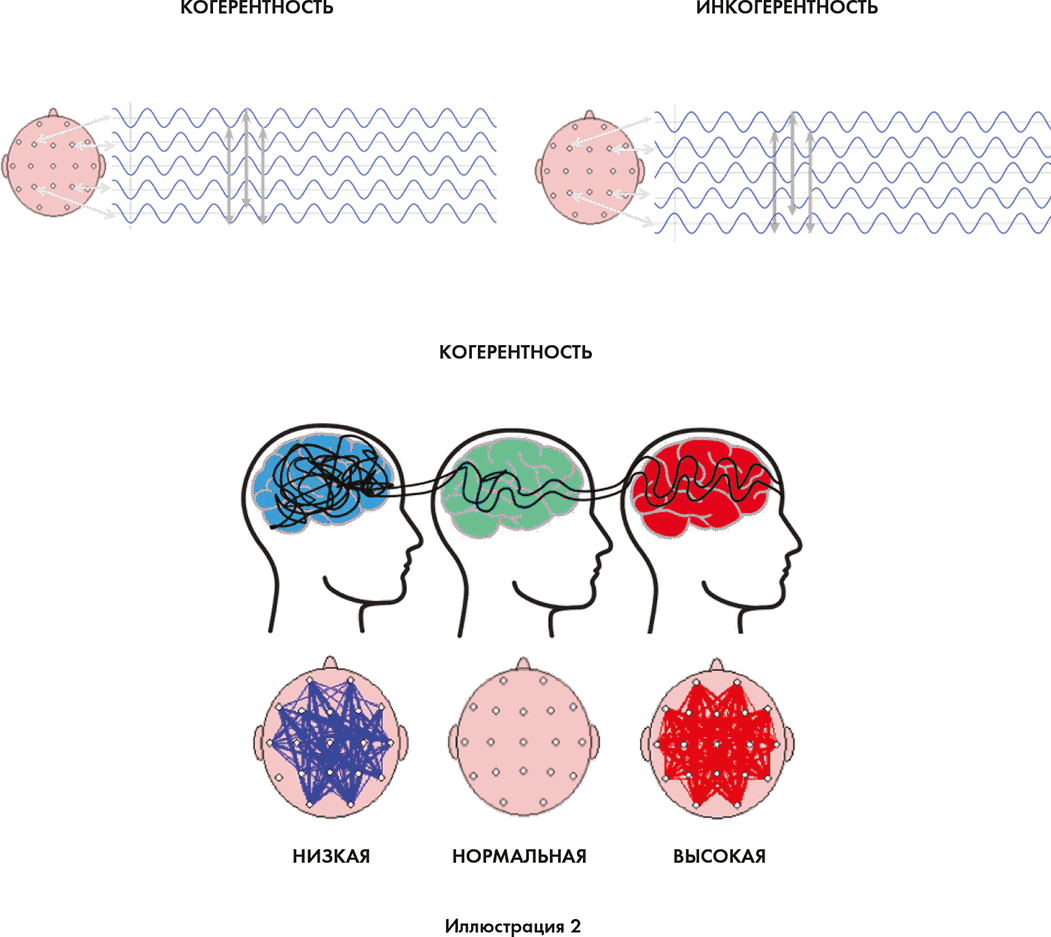 На первом рисунке оба круга представляют собой вид сверху на голову человека в энцефалографическом шлеме. Голова смотрит вперед, так что нос направлен вверх страницы, а уши расположены по обеим сторонам. Тонкие белые круги представляют собой различные отделы мозга, где мы можем измерять мозговые волны в особых областях. Слева вы видите, что все стрелочки идеально выровнены, показывая синфазные волны. Это когерентность. А справа вы видите, что волны мозга не синфазны и стрелочки стоят не в ряд с подъемами и спадами. Это инкогерентность. Поскольку я буду показывать вам различные сцинтиграфии мозга на последующих страницах, я хочу, чтобы вы познакомились с тем, как мы измеряем когерентность и инкогерентность. Посмотрите на второй набор рисунков. Преобладание в мозгу синего цвета обозначает низкую когерентность (гипокогерентность), и тогда различные области мозга меньше сообщаются между собой. А преобладание в мозгу красного обозначает высокую когерентность (гиперкогерентность), и тогда различные области мозга больше сообщаются между собой. Если же отсутствуют и синий, и красный цвета, это обозначает нормальную, или среднюю, когерентность.