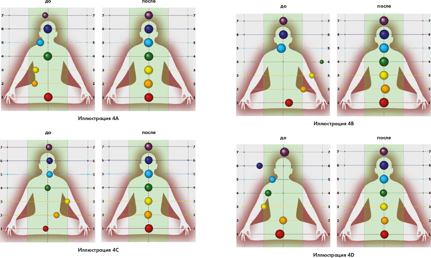 Рисунки слева показывают измерения газоразрядной визуализации энергоцентров наших студентов до того, как они приняли участие в продвинутом занятии. Рисунки справа показывают изменения, наступившие через несколько дней после медитации на благословение энергоцентров. Обратите внимание на разницу в размерах и положении каждого центра.