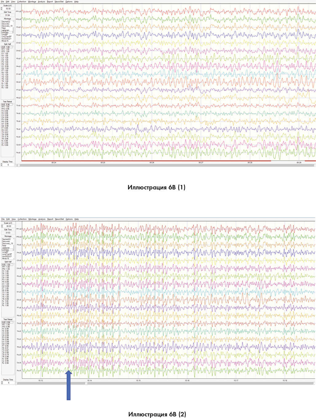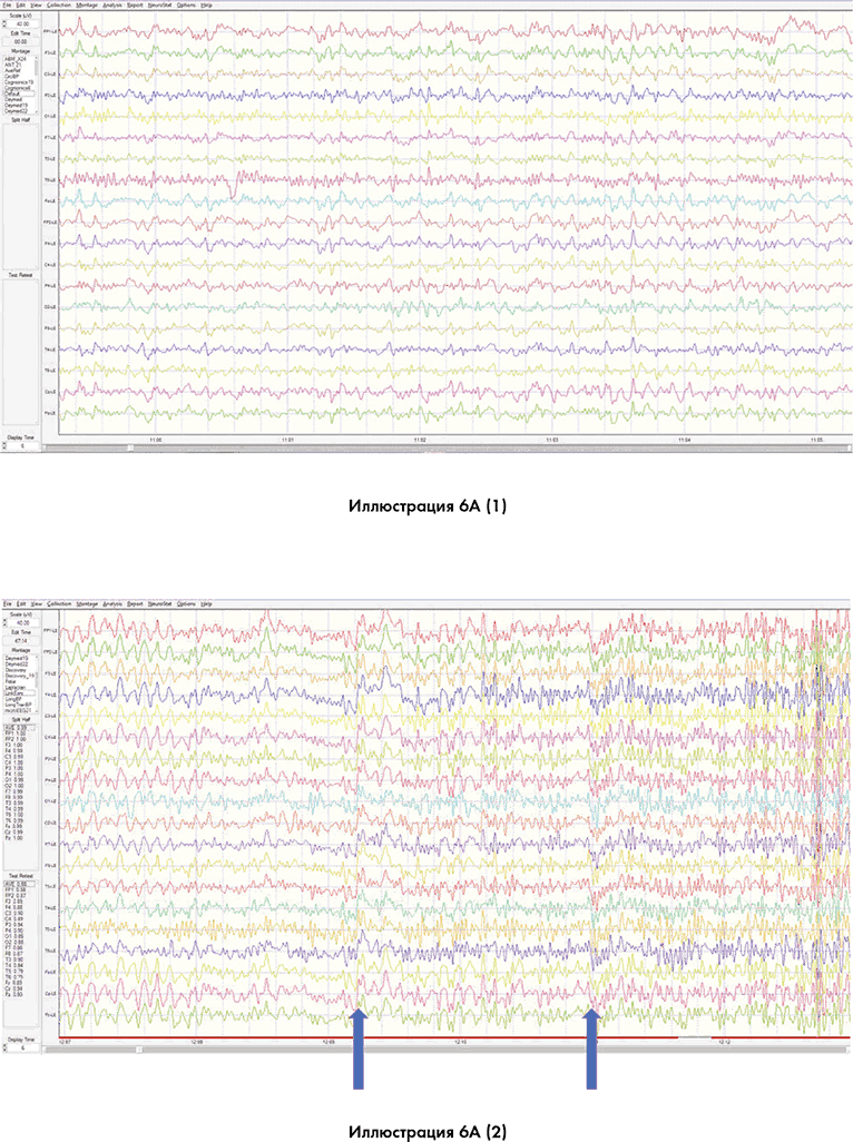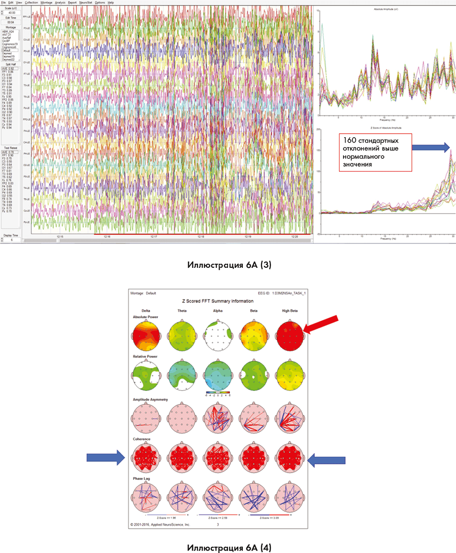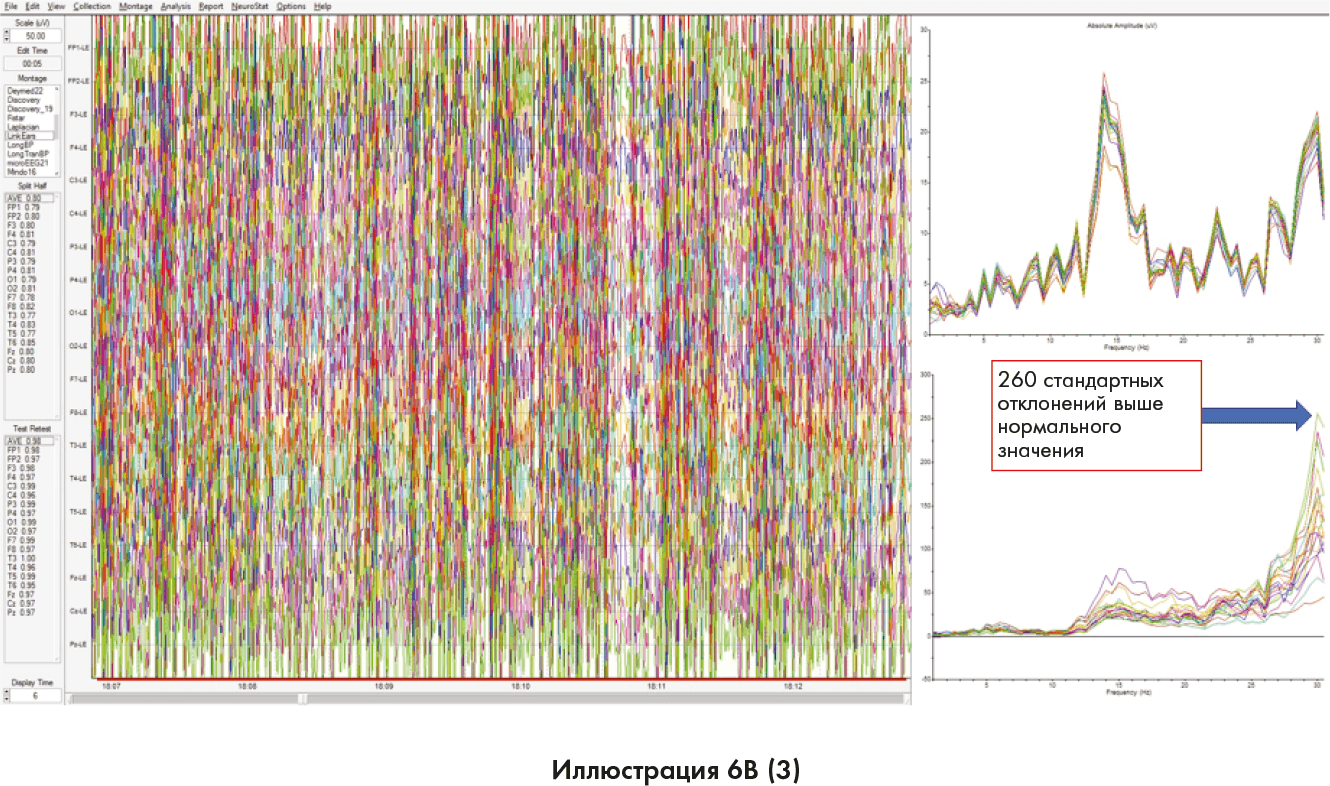 Вы видите схожие изменения на этих иллюстрациях. Синяя стрелка в нижней части ленточной диаграммы на иллюстрации 6B (2) показывает момент, когда мозг переходит из высокого бета-диапазона в гамма-диапазон. Иллюстрация 6B (3) показывает, что энергия в мозгу составляет 260 стандартных отклонений выше нормального значения. В данном контексте 99,7 % населения укладываются в пределы 3 стандартных отклонений выше или ниже нормального значения. Все за пределами 3 стандартных отклонений можно считать сверхъестественным.