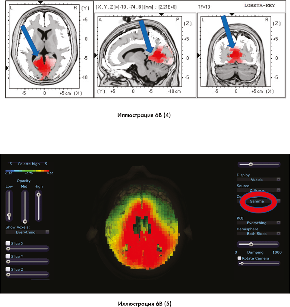 Красная область мозга, на которую показывают синие стрелки на иллюстрации 6B (4), – это область, окружающая шишковидную железу, а также область, называемая полем Бродмана, связанную с сильными эмоциями и образованием новых воспоминаний. Наша команда видит этот паттерн в тех областях мозга неоднократно, когда студенты переводят свои мозговые волны в гамма-диапазон. Иллюстрация 6B (5) показывает трехмерное изображение мозга того же студента снизу, где виден значительный объем энергии, выходящей изнутри лимбического мозга.
