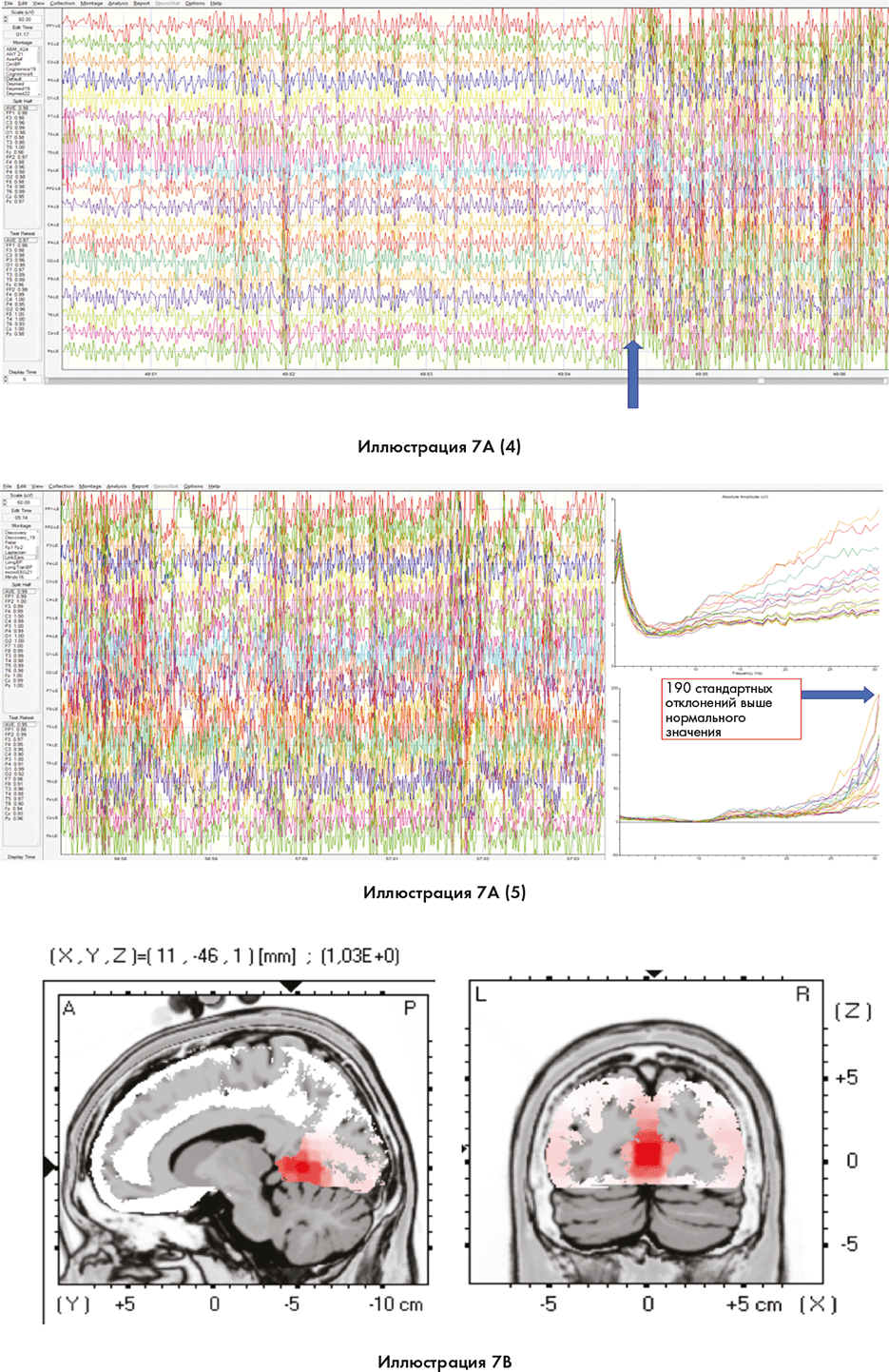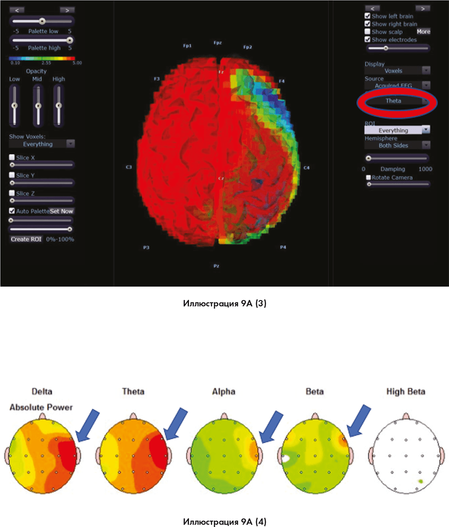 Красный овал справа показывает измерения мозга в тета-диапазоне. Иллюстрация 9A (4) показывает сцинтиграфию мозга человека с другими частотами мозговых волн в то время, как он смотрит в калейдоскоп. Красная и оранжевая области, отмеченные синими стрелками, справа от каждого изображения мозга показывают большой объем активности в мозговых волнах в диапазонах дельта, тета, альфа и бета.