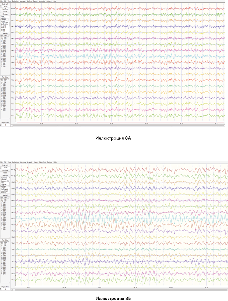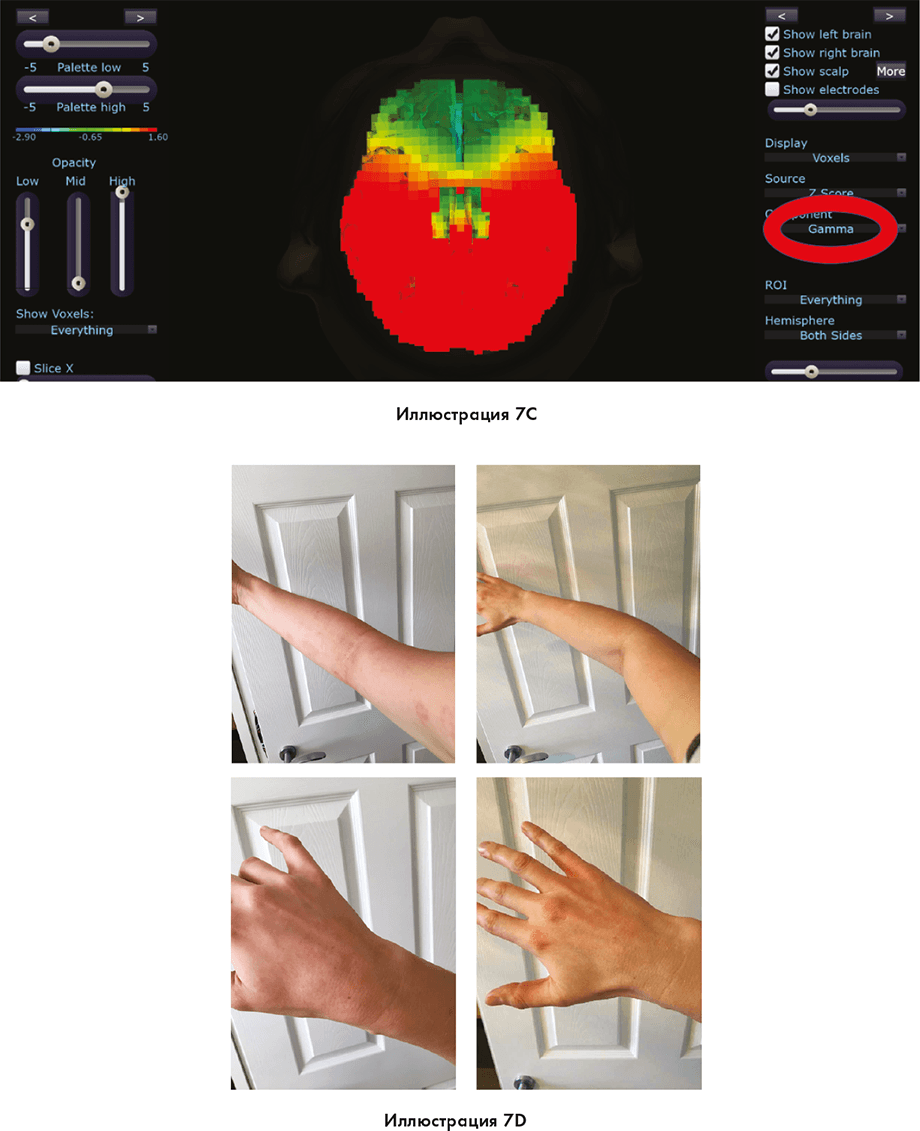 Иллюстрации с 7A (1) до 7A (5) показывают переход мозговых волн Фелиции из нормального в высокий бета-диапазон перед тем, как она переходит в высокоэнергетическое состояние гамма-диапазона (синяя стрелка отмечает переход). Энергия в гамма-диапазоне превышает нормальное значение на 190 стандартных отклонений, когда Фелиция входит в единое поле. Область шишковидной железы, а также часть мозга, обрабатывающая сильные эмоции, пребывают в состоянии высокой активности, как видно по иллюстрации 7B. Изображение на иллюстрации 7C показывает мозг снизу. Красная область демонстрирует, что энергия в гамма-диапазоне выходит изнутри лимбического мозга. Взгляните на иллюстрацию 7D, чтобы увидеть изменения в состоянии кожи Фелиции на следующий день после того, как она получила биологическое обновление из единого поля.