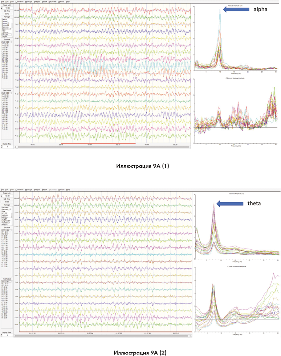 Иллюстрация 9A (1) показывает сцинтиграфию мозга человека, мозговые волны которого пребывают в когерентном альфа-диапазоне в то время, как он смотрит в калейдоскоп. Иллюстрация 9A (2) показывает человека, мозговые волны которого пребывают в когерентном тета-диапазоне в то время, как он смотрит в калейдоскоп в состоянии транса. Иллюстрация 9A (3) показывает трехмерное изображение мозга (всего в красном цвете) другого человека, почти весь мозг которого пребывает в состоянии тета-диапазона.