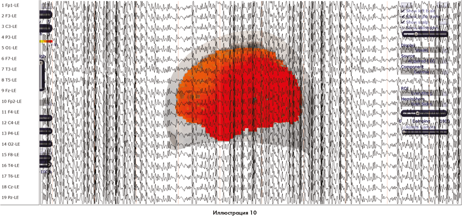Это мозг, полностью вовлеченный во внутренний опыт умственного кино. Наблюдается значительный объем когерентных мозговых волн в высоком бета– и гамма– диапазоне, активирующих весь мозг.