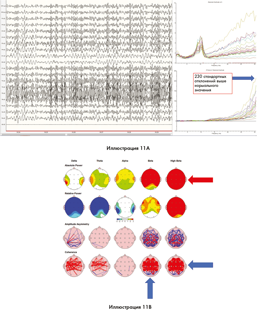 Этот человек сообщил о том, что он испытал полноценный чувственный опыт без задействования физических органов чувств, когда развернул сцену в своем умственном кино во время медитации. На иллюстрации 11A вы видите, что мозг человека пребывает в когерентном состоянии в высоком бета– и гамма-диапазоне. Энергия в его мозгу превышает нормальное значение на 230 стандартных отклонений. Красная стрелка на иллюстрации 11B показывает довольно значительный объем энергии в высоком бета-диапазоне, переходящем в гамма-диапазон. Синие стрелки также показывают высокую степень когерентности в мозгу. Здесь важно отметить, что человек не может просто заставить свой мозг сделать это. Это происходит при переживании полноценного внутреннего опыта.