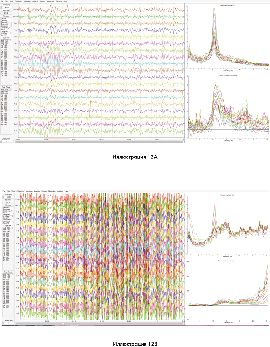 Иллюстрация 12A показывает базовые измерения человека с нормальными мозговыми волнами в бета– и альфа-диапазоне до начала ходячей медитации. Если вы посмотрите на его сцинтиграфию на иллюстрации 12B, сделанную после медитации, через час и двадцать минут, вы увидите, что его мозг пребывает в высокоэнергетическом состоянии гамма-диапазона.