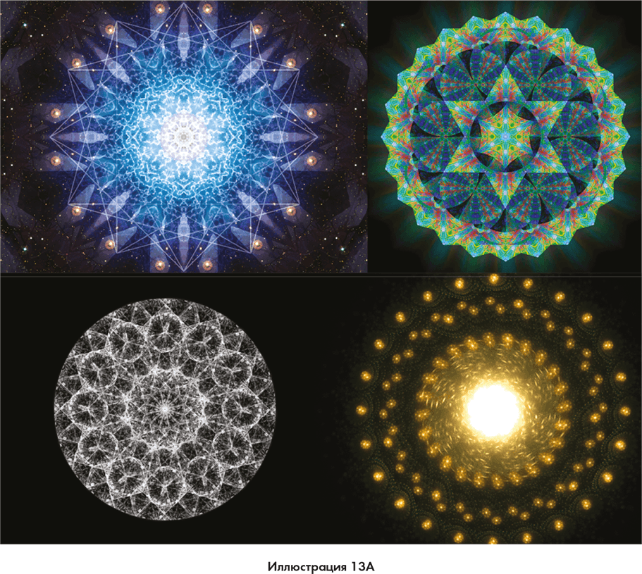 Фрактальные фигуры в виде сложных геометрических конфигураций являются стоячими волнами частоты и информации, которые мозг может дескремблировать в очень мощные образы. И хотя эти образы двухмерные, они дают вам представление о том, как выглядят эти фигуры.