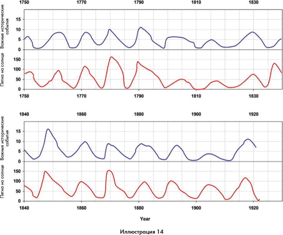 Александр Чижевский провел сопоставление важных политических и общественных событий в период с 1749-го по 1926 год с повышением солнечной активности. На графике синяя линия иллюстрирует вспышки на солнце, а красная линия относится к человеческой возбудимости. Заметьте, что каждый раз, когда повышается солнечная активность, также повышается и активность человеческой деятельности.