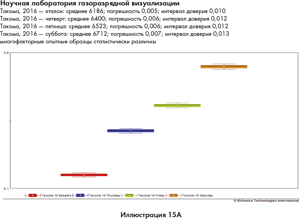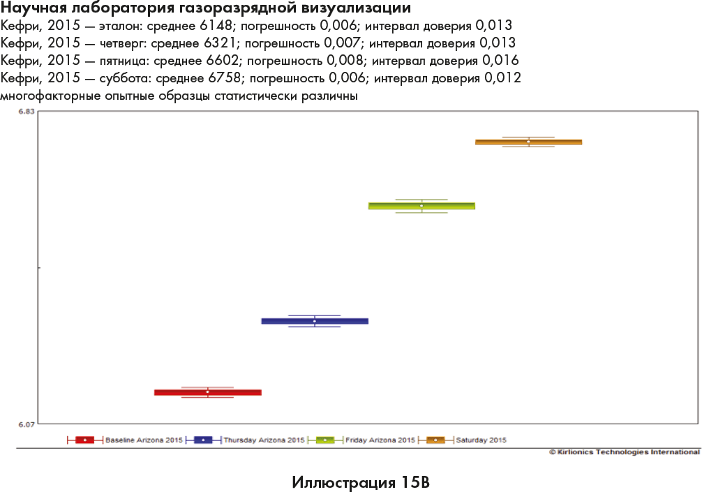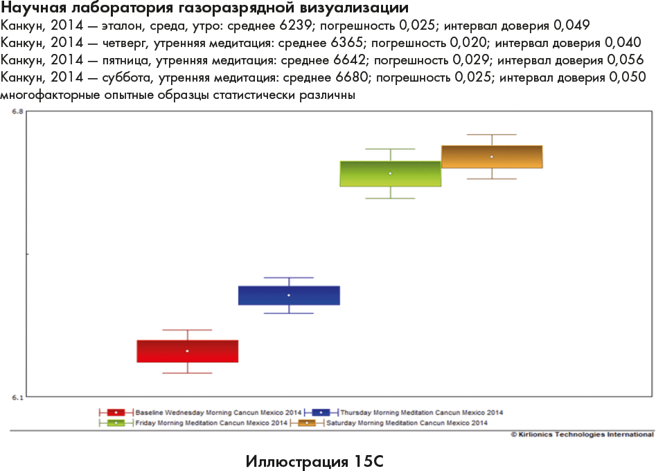 Иллюстрации 15A и 15B демонстрируют возрастание коллективной энергии в комнате в течение 3 дней на наших продвинутых семинарах. Первая линия, красная, показывает наше базовое измерение энергии в комнате до начала занятий в среду. Глядя на красную, синюю, зеленую и коричневую линии (каждый цвет представляет отдельный день), вы увидите, что каждый день энергия устойчиво возрастает.